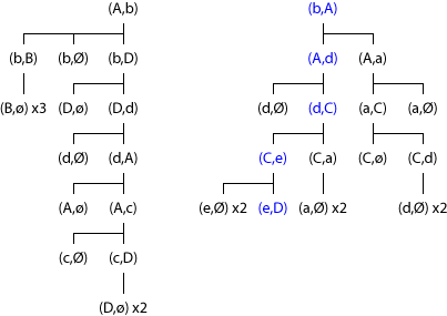 Also included below is a complete chart of the problem space for this example puzzle. Each hexagon has been given a corresponding letter, and the different players are distinguished by capital and non-capital letters. Every letter pair notes where each player is at the end of a turn, with the first letter about to move next. Since either player could be the first to move, there are two different problem spaces. An "Ø" character represents when a player is about to make a move off of the board. The correct solution is highlighted in blue.