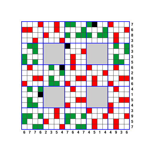 There are several different stamp orientations that would cover the shaded hint square in the second vertical tier from the right. One orientation of Stamp 1 and one orientation of Stamp 2 would leave a middle column that should have no more shaded squares. This means Stamp 1 would have to be used in the two remaining empty blocks in that vertical tier, but the rest of the columns don’t add up to the appropriate number of squares. One orientation of Stamp 2 has too many shaded squares in one column. This leaves one last orientation of Stamp 2, and subtracting, we find zero squares to be shaded one column. Two copies of Stamp 1 fit in the other two empty blocks.