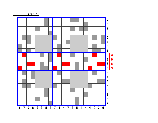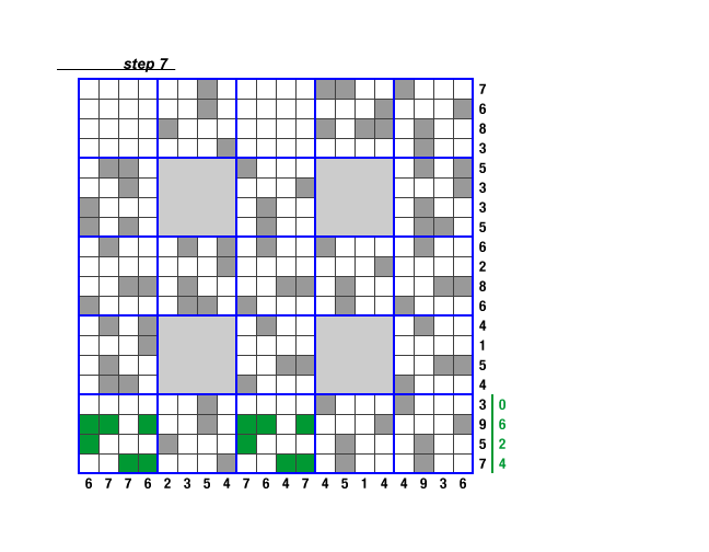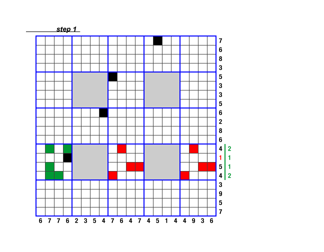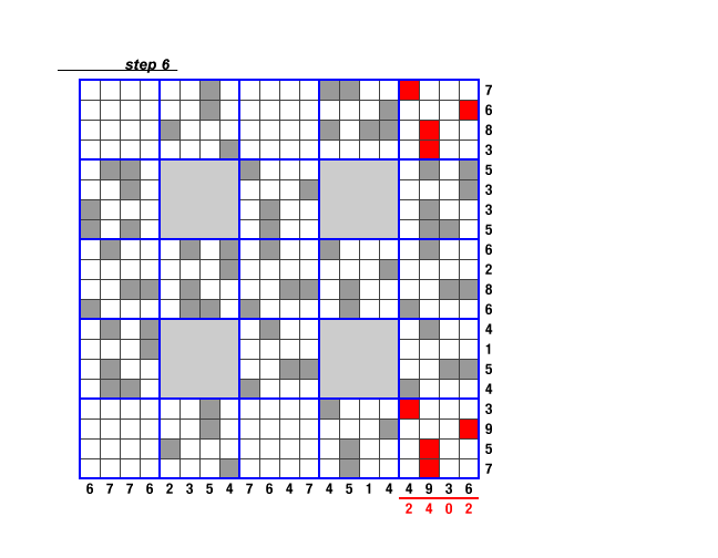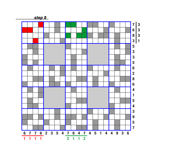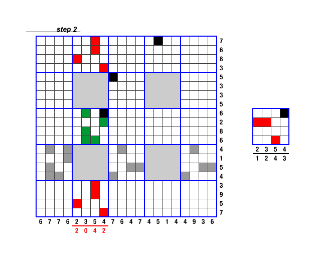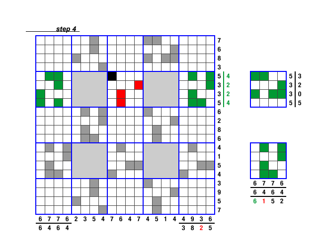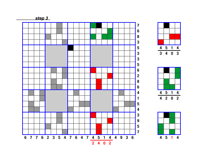 The last shaded hint square is another corner square, meaning we can use one orientation of Stamp 1 or one orientation of Stamp 2. Trying Stamp 2, we obtain a middle row with zero squares left to be shaded. Stamp 1 would have to be used to keep the remaining blocks clear in that row, but the other rows don’t add up to the appropriate number of shaded squares. Thus Stamp 1 fits in the hint block. This leaves the two empty blocks in that tier to be filled by Stamp 2, but there are two different orientations that could work for each block. For the block on the right, subtracting the one stamp that has already been placed in step 1, there is one column that only needs two more shaded squares. This eliminates the alternative possibility for the block on the right. For the block on the left, again subtracting the one stamp that has already been placed in step 1, we’re still left with both possibilities. Testing each shows that one possibility leaves six squares to be shaded in an outer column (requiring three copies of Stamp 2 for the remaining blocks) and only one square to be shaded in an inner column (requiring at least two copies of Stamp 1). This eliminates the alternative possibility for the block on the left.