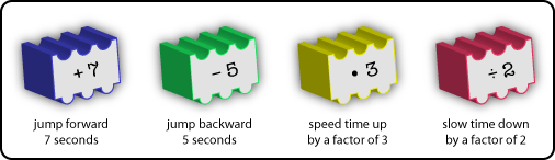 With the blocks in this order, you'd jump forward 7 seconds and move at a rate 3 times normal speed... ...but with the blocks in this order, you'd jump forward 21 seconds and move at a rate 3 times normal speed. Remember that the effects of the time travel circuit blocks are cumulative, meaning that later (lower) blocks may enhance the effects of earlier (higher) blocks.